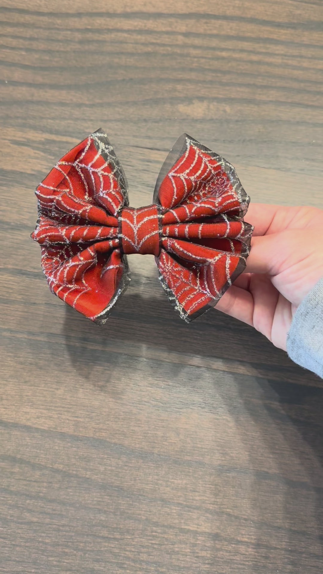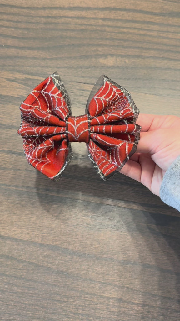 This classic style bow is the showstopper of the Webbed & Wild Collection. It's a true pumpkin orange, layered under a black tulle with silver glitter webs. It's equal parts spooky and glam.