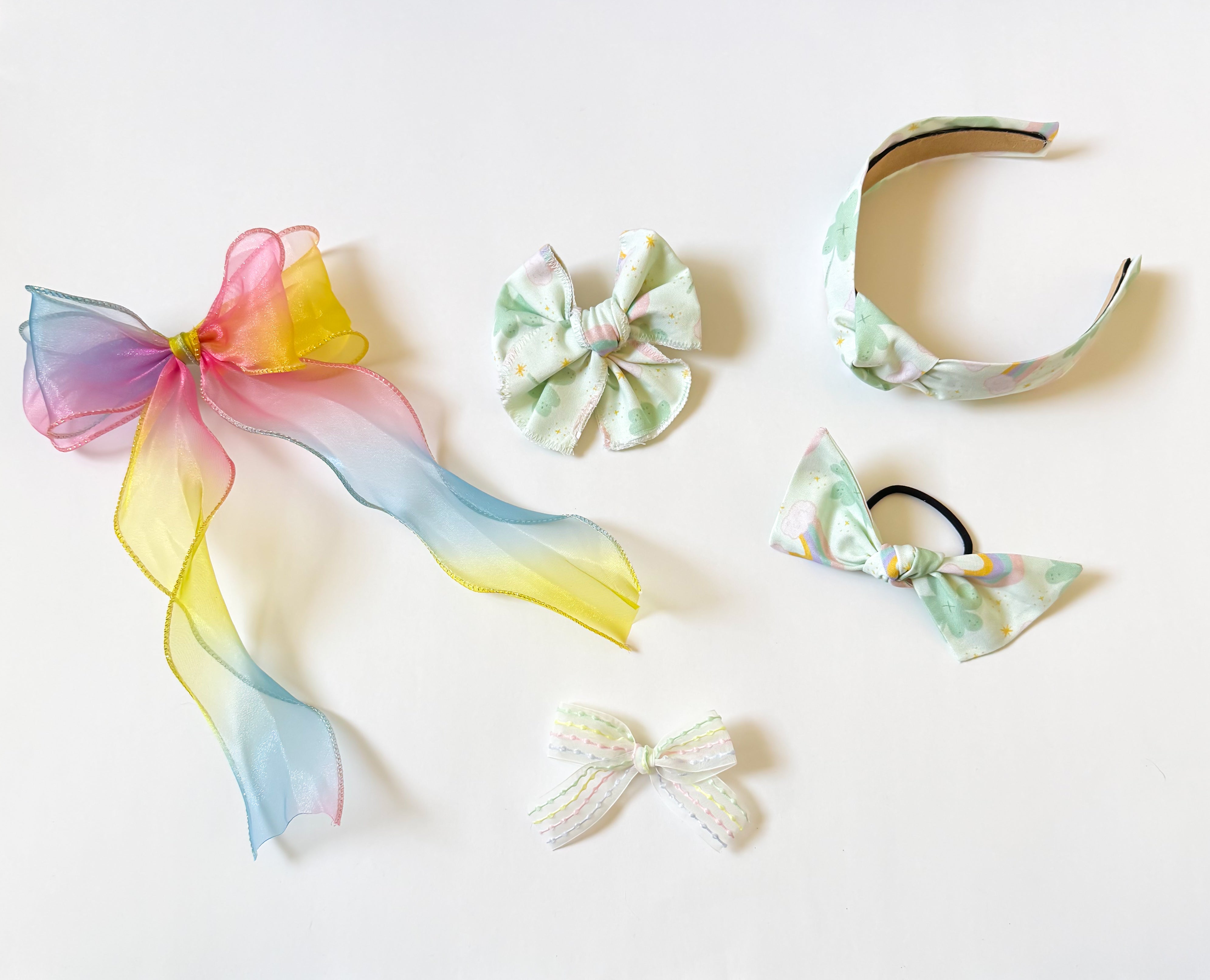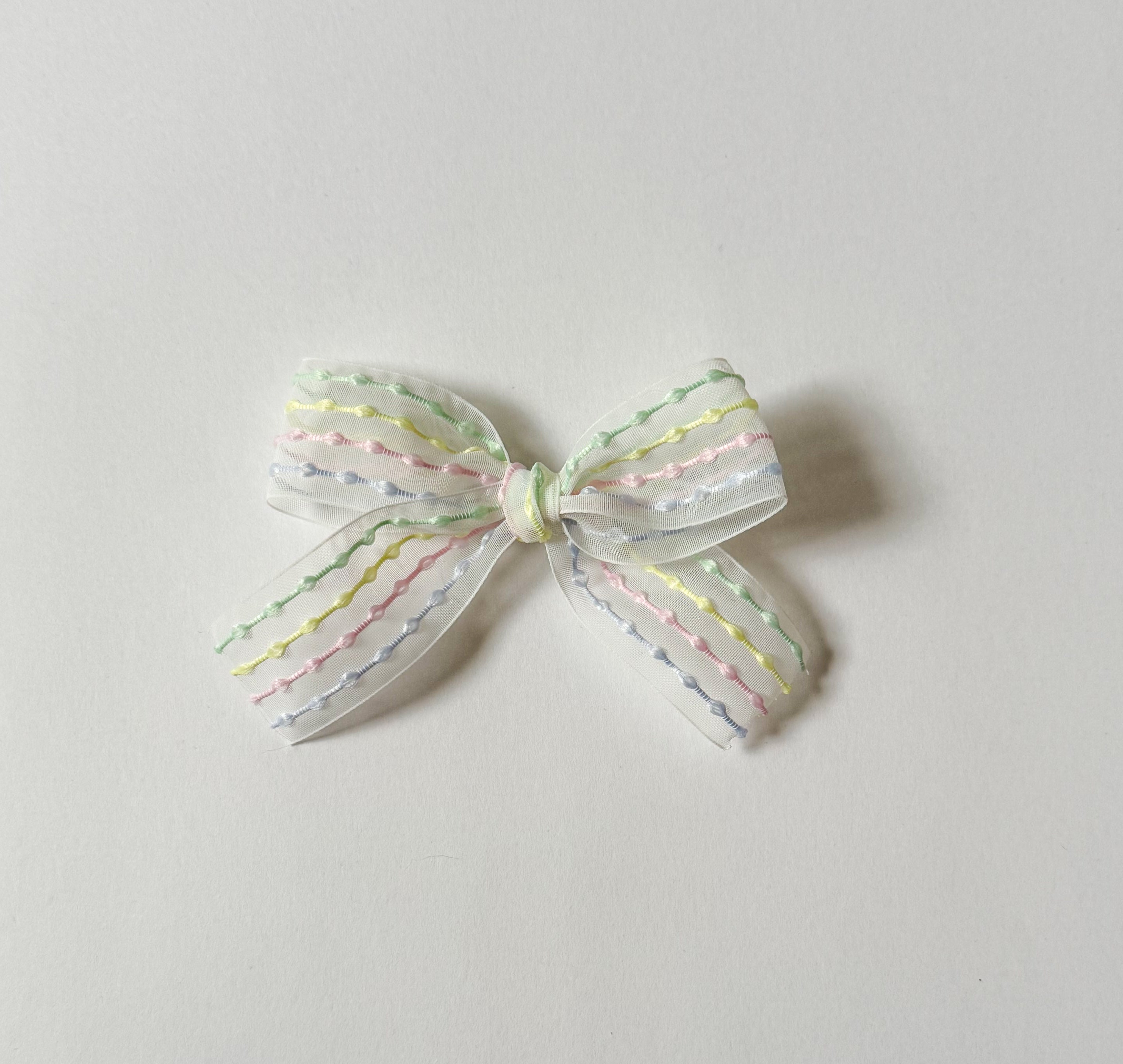 A dainty white sheer Olivia style bow made from lightweight organza, detailed with soft pastel embroidered stripes in pink, yellow, mint, and baby blue. The stitched dotted lines give it a subtle textured “confetti” effect, while the translucent fabric keeps it airy and delicate. Perfect for spring, Easter, or everyday pastel outfits.